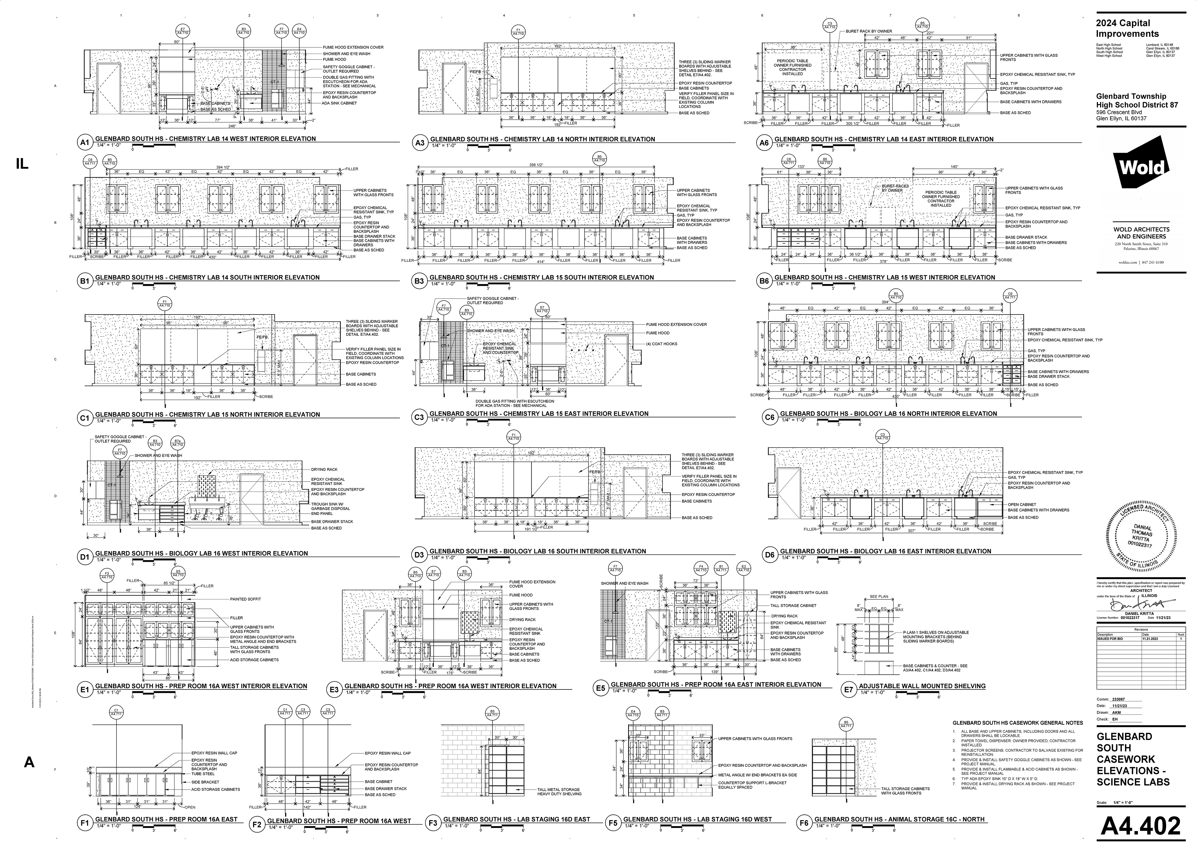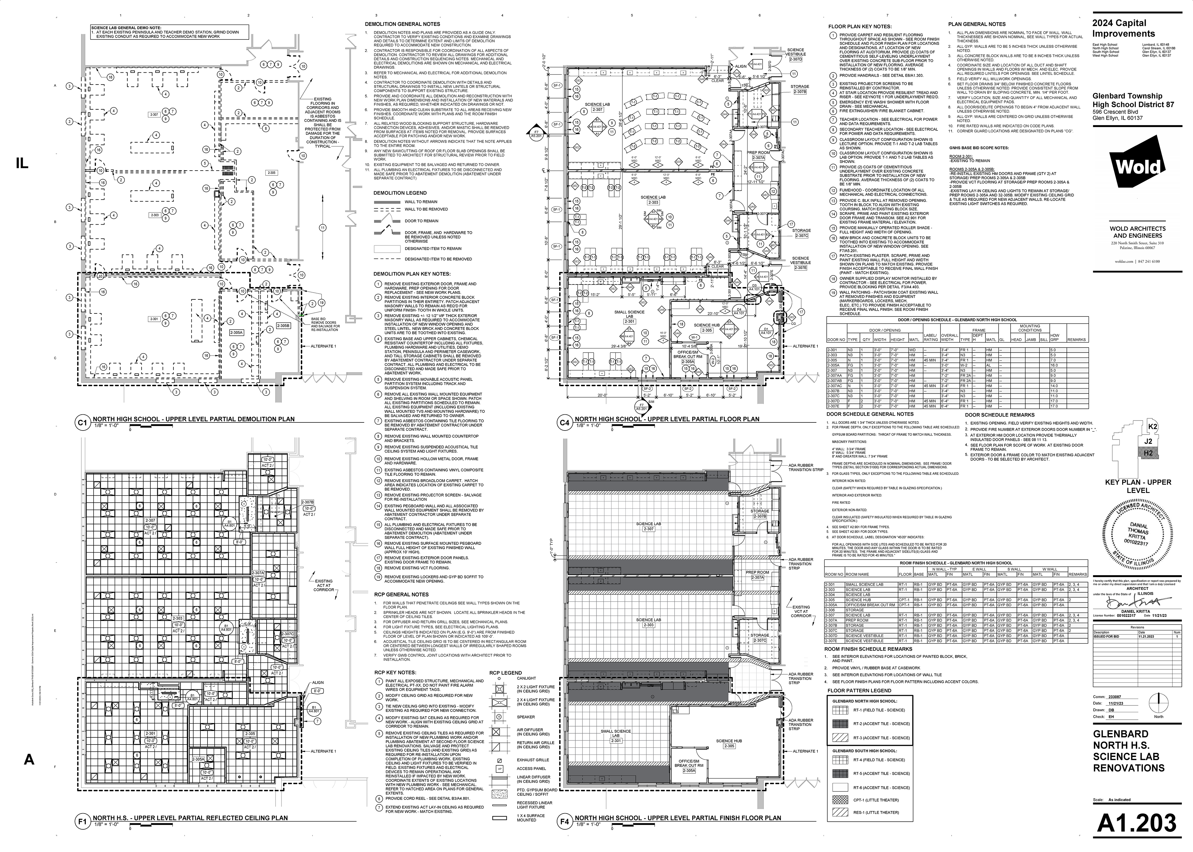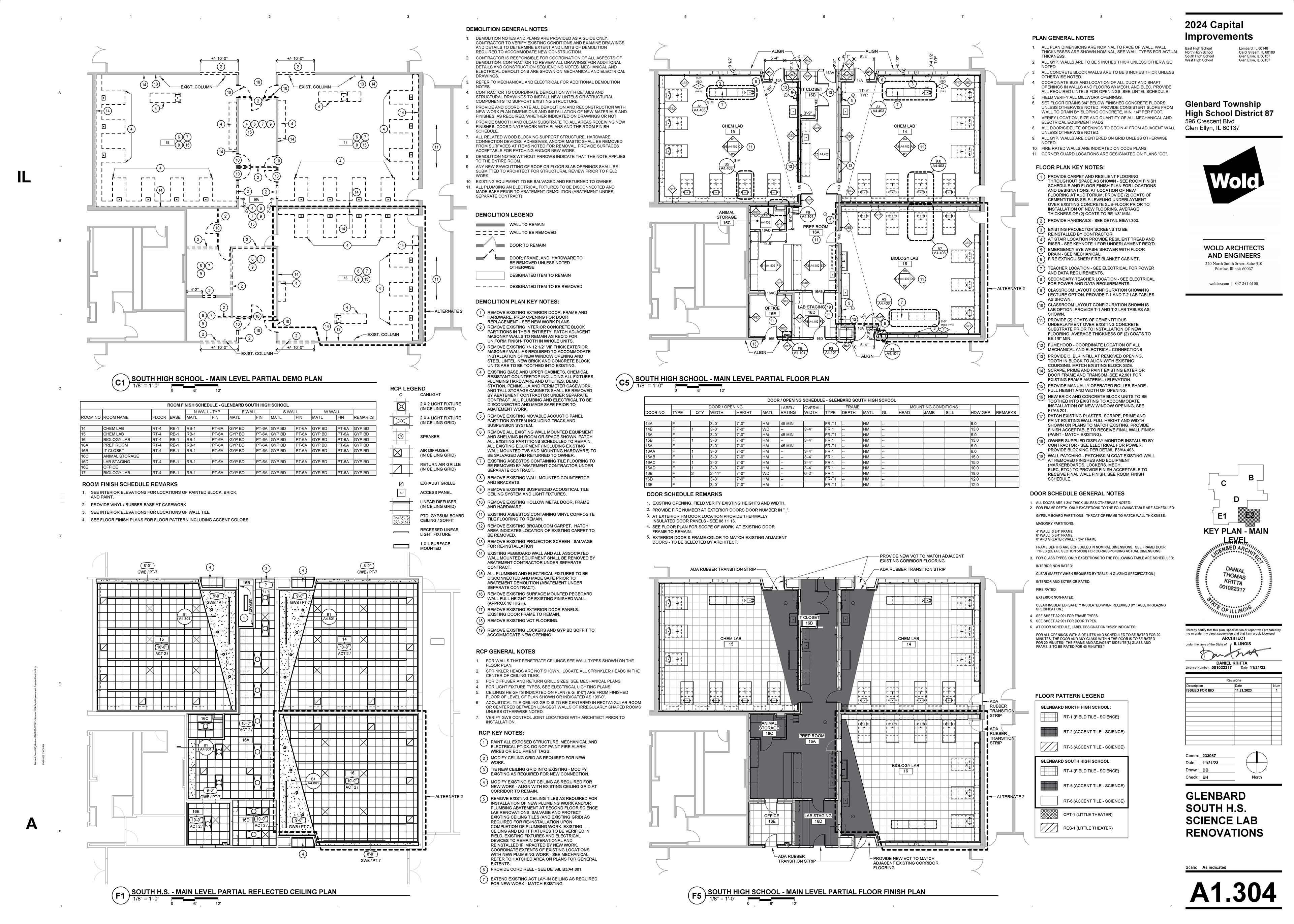 Below are pages from a Construction Document set I worked on for 2024 Capital Improvements for four high schools in the Glenbard School District in Glen Ellyn, Lombard, and Carol Stream Illinois. All work completed while employed at Wold Architects and Engineers.