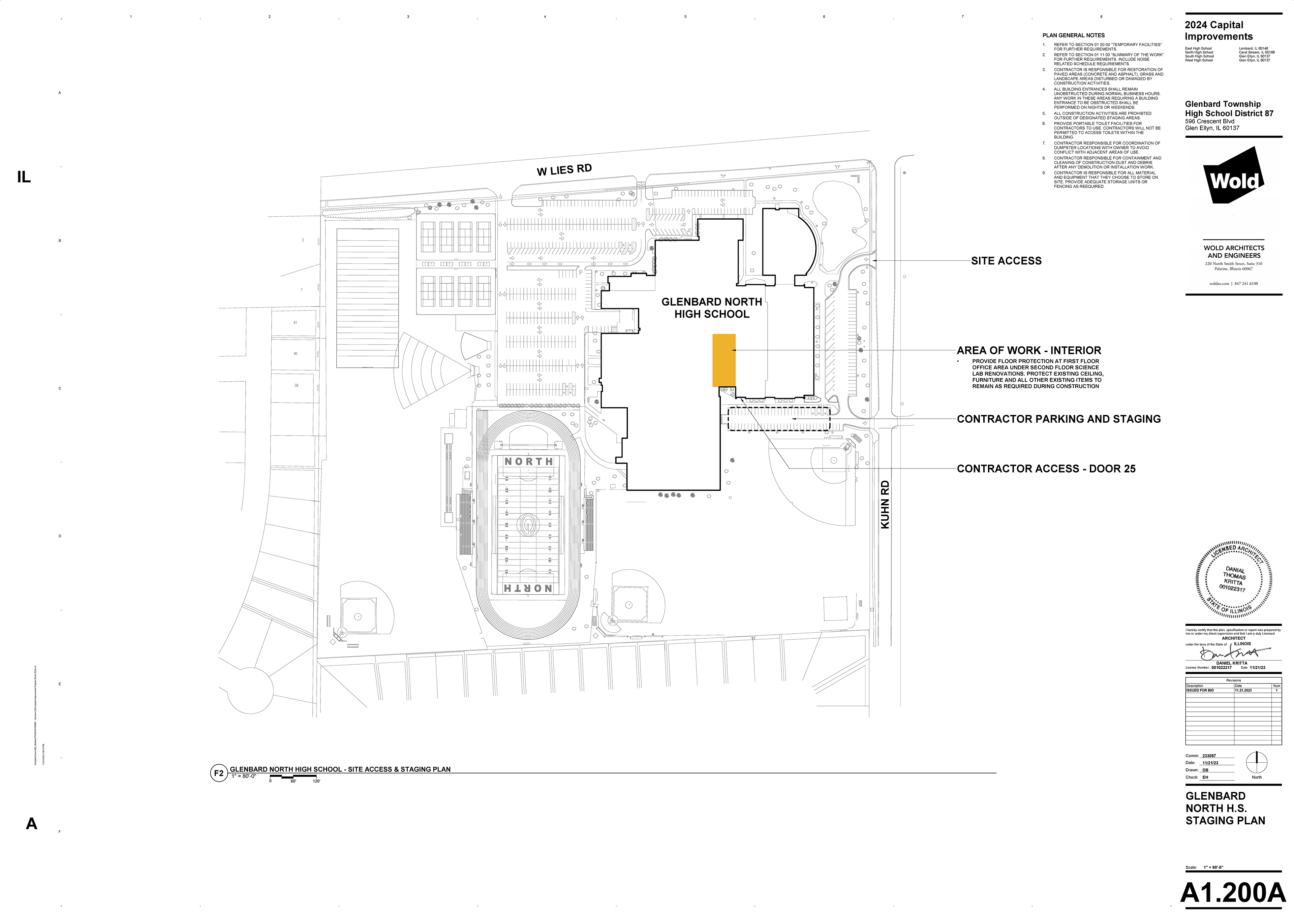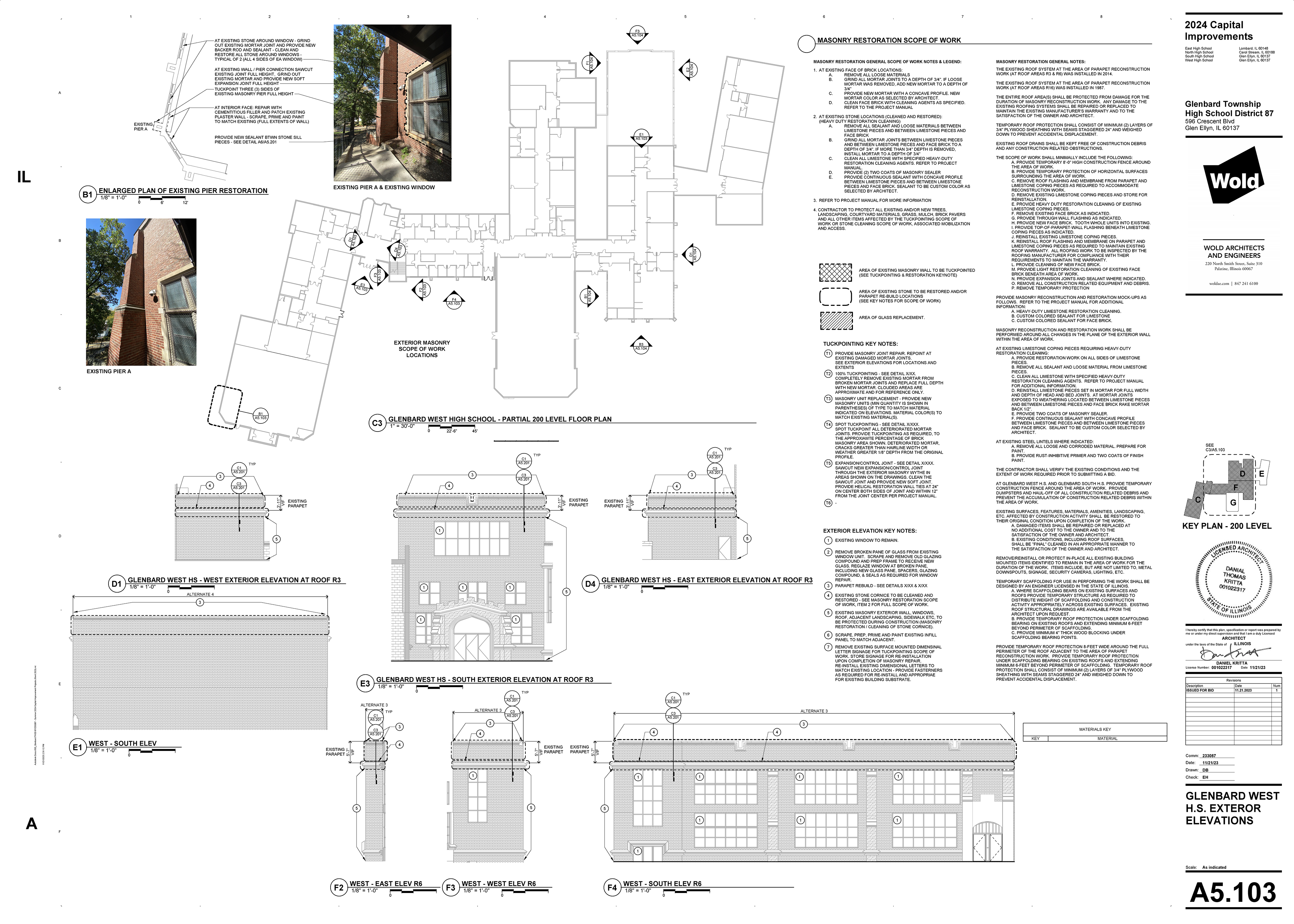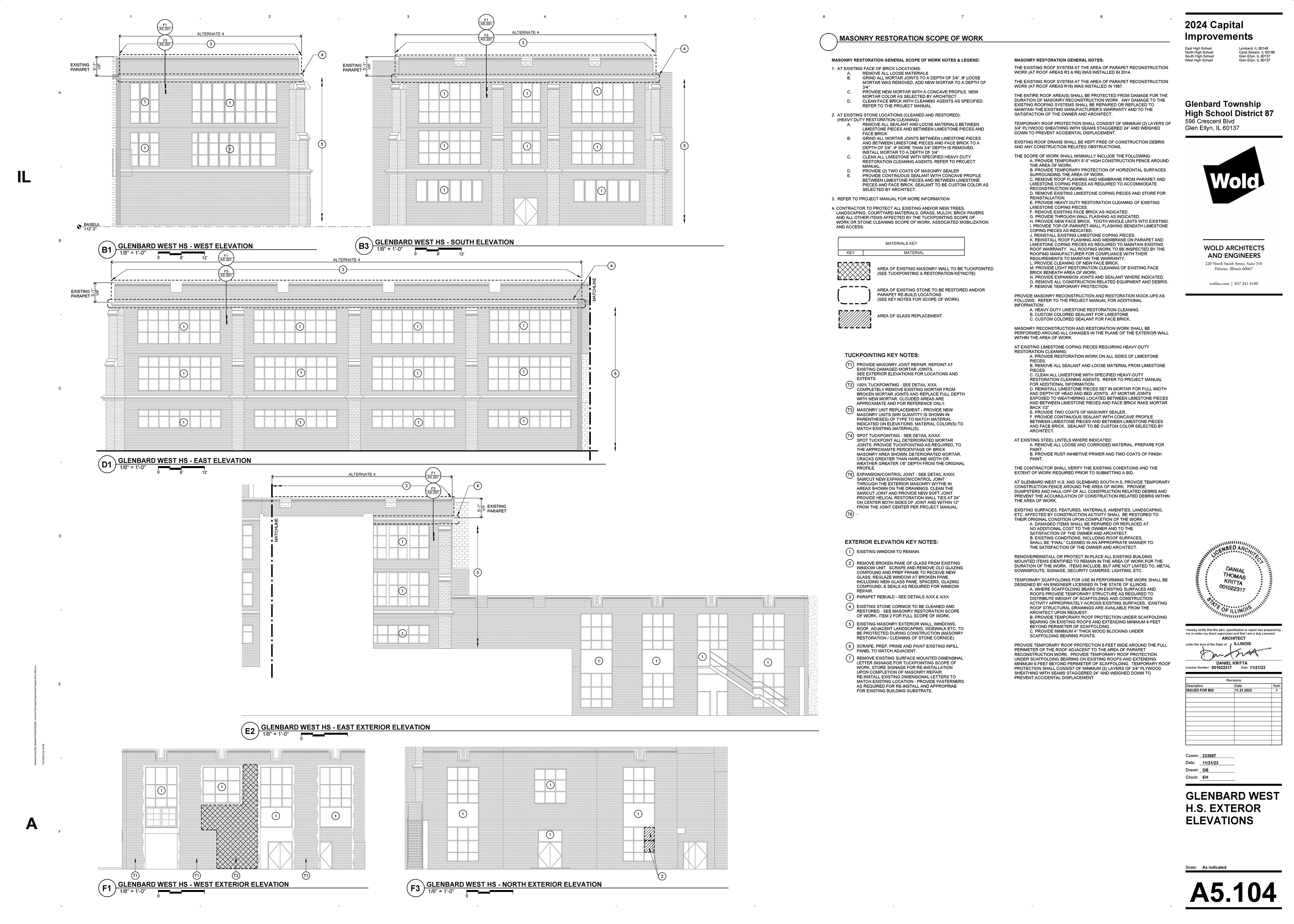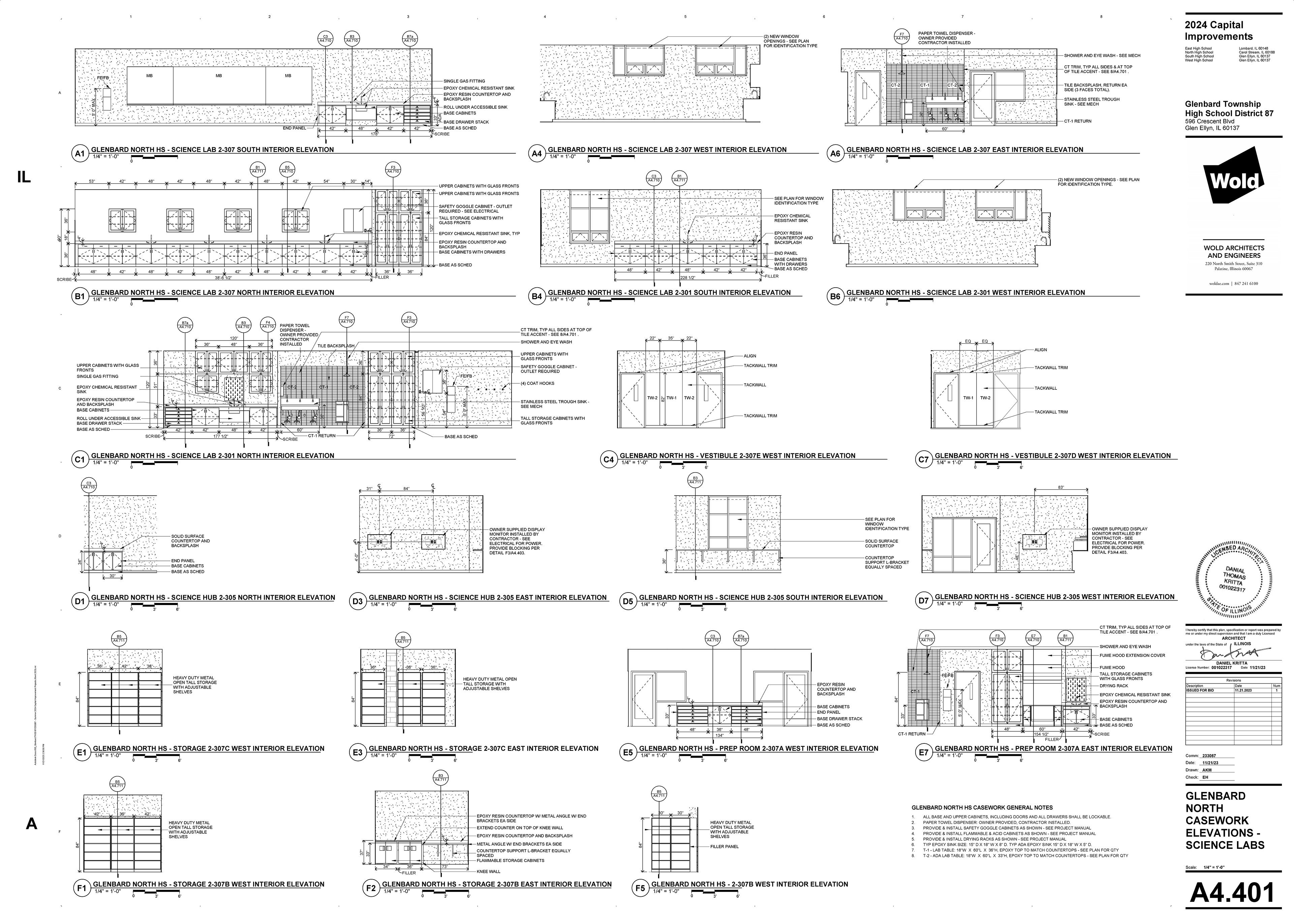 Below are pages from a Construction Document set I worked on for 2024 Capital Improvements for four high schools in the Glenbard School District in Glen Ellyn, Lombard, and Carol Stream Illinois. All work completed while employed at Wold Architects and Engineers.